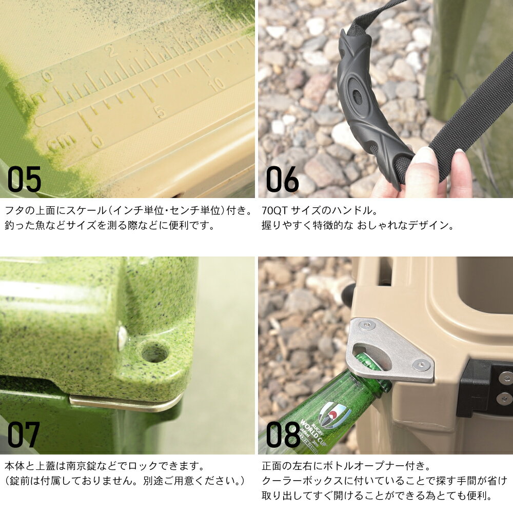 商品名 アイスランド クーラーボックス 70QT(66.2L) カラー グリーンカモ Green camo 容量 70QT(66.2L) サイズ 幅820×奥行435×高さ445mm 重量 16.42kg 付属品 まな板(仕切り板)・かご・カップホルダー2個 素材 リニアポリエチレン、ポリウレタン、ポリプロピレン ご注意 樹脂の性質上、製造工程やパッキングによる擦れ、キズ、バリ、気泡等がある可能性がございますが使用上は問題ありません。
